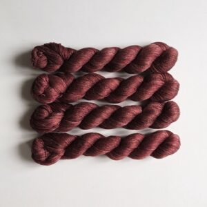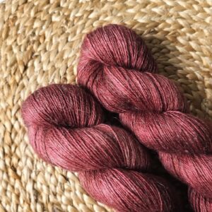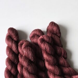 Garnet er håndfarvet af mig med syrefarver i min lille enmandsproduktion på Frederiksberg. Jeg har fokus på bæredygtighed igennem alle processer af farvningen og køber kun garn som er dyreetisk i orden. Garnet er nænsomt håndvasket med allergi-venlig uldsæbe efter farvning og burde ikke smitte af. Det anbefales dog alligevel at vaske dit strik sjældent og i køligt vand – så holder både farver og fibre længere.